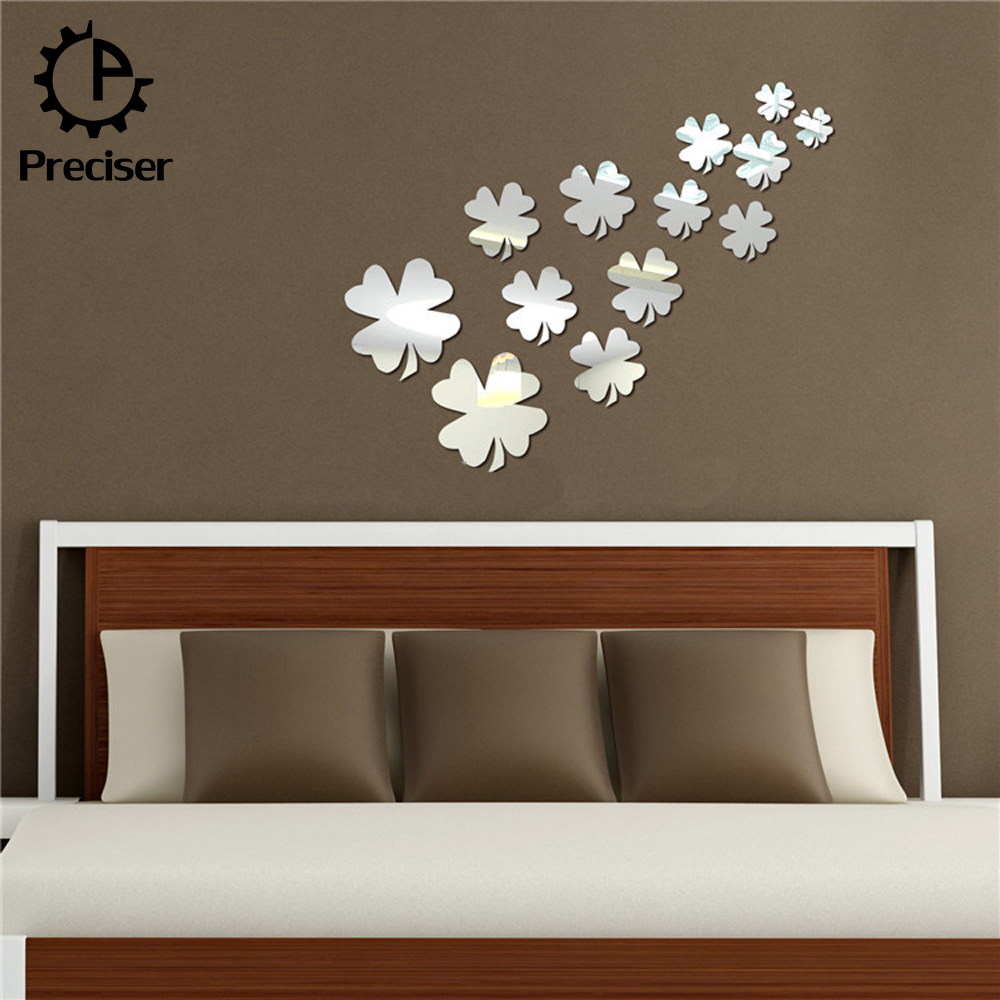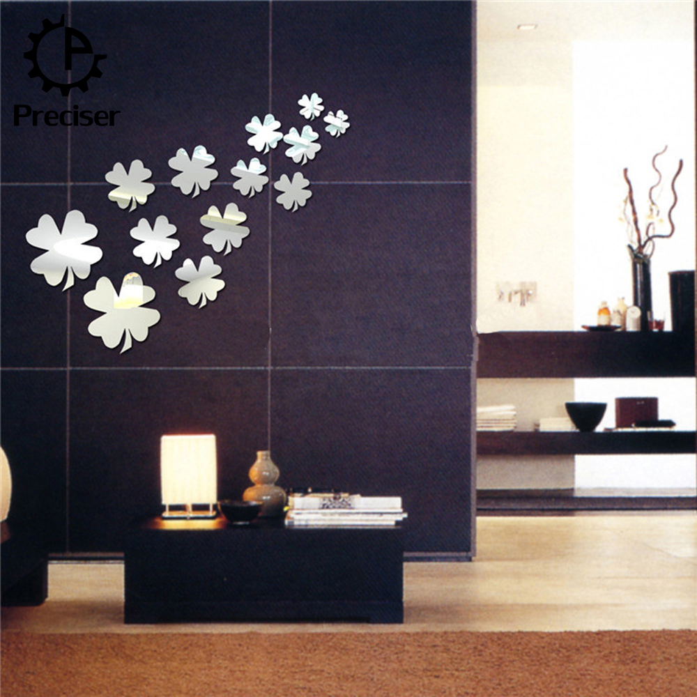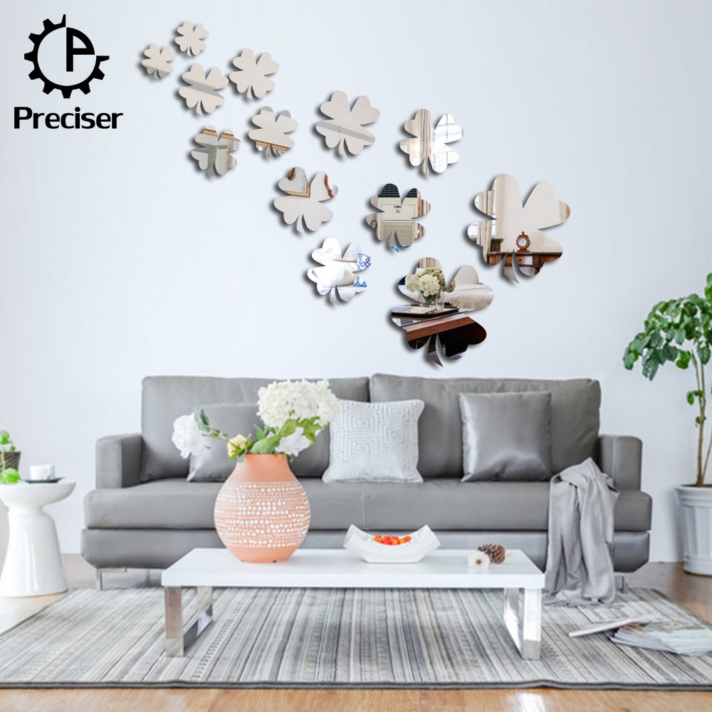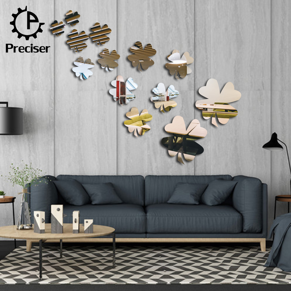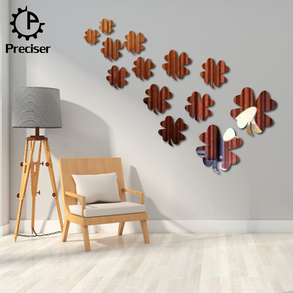 13pcs Lucky Clover Leaves Crystal DIY Mirror Effect Reflective 3D Wall Stickers Home Decoration Living Room Bedroom Bathroom Decor Mural Decal adesivo de parede Removable Kid's Room Design Art
