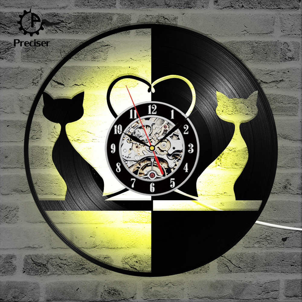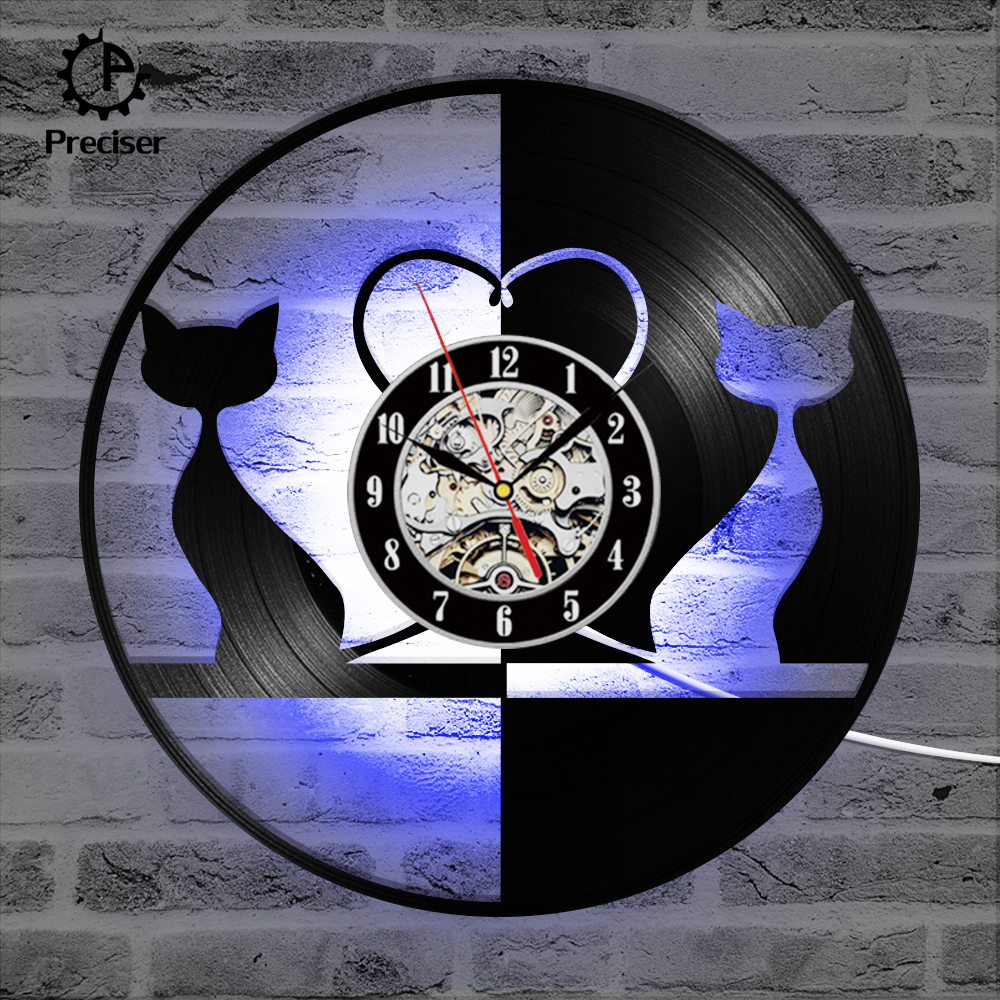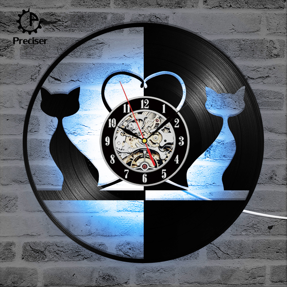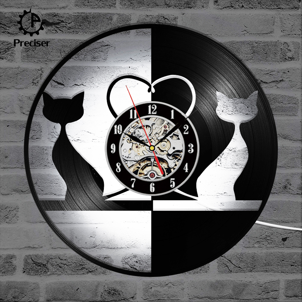 Round Black and White Lovely Cat Record Clock Hollow Creative and Antique Style Hanging Wall Clock Vinyl Record 3D Art Clock