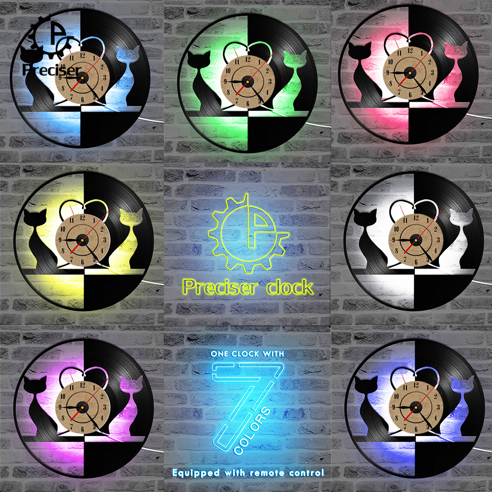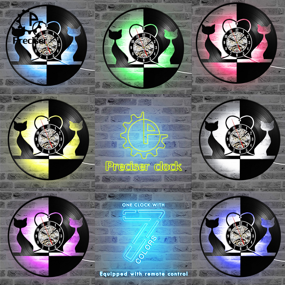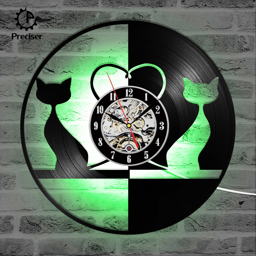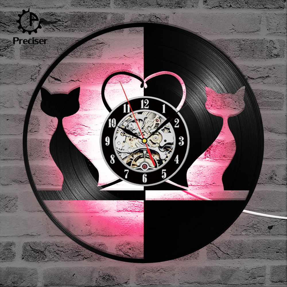 Round Black and White Lovely Cat Record Clock Hollow Creative and Antique Style Hanging Wall Clock Vinyl Record 3D Art Clock