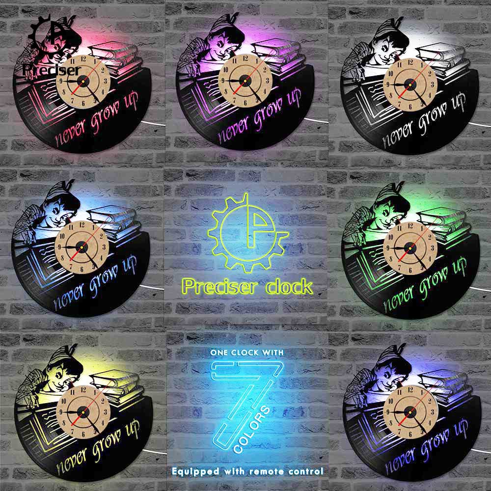 Peter Pan Vinyl LP Record Wall Clock Never Grow Up Hanging 3D Clock Personalized Kids Room Decor CD Record Clock Black Hollow Round Creative Antique Style Hanging Clock