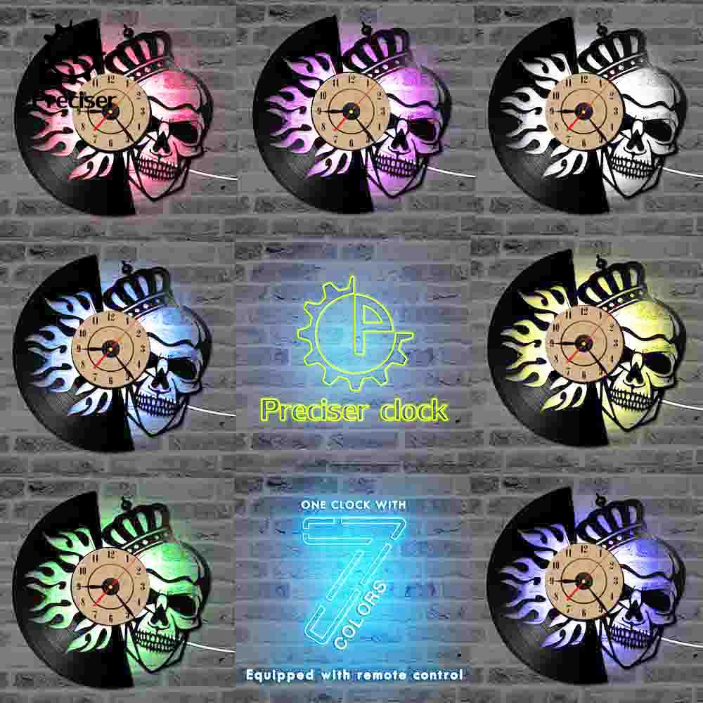 Round Hollow Record Clock Skull With Crown On Fire Vinyl Record Hanging Wall Clock 3D Handmade Vintage Clock Creative Home Decor